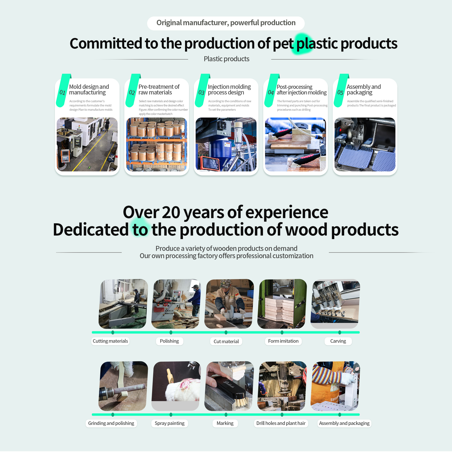 The company constantly strengthens and improves its own quality capabilities, overcome difficulties, and forge ahead. The company has formed a relatively complete industrial chain, integrating design and development, mold manufacturing, injection molding, wood molding, stamping molding, special printing, electrostatic spraying, vacuum coating, hair planting, assembly and packaging, and non-standard automation modern factory. It has laid a solid foundation for high-quality, high-output, and low-cost manufacturing.The company's products have entered PET SMART, PET CO, WALMART, ALDI and other world-renowned retail companies.